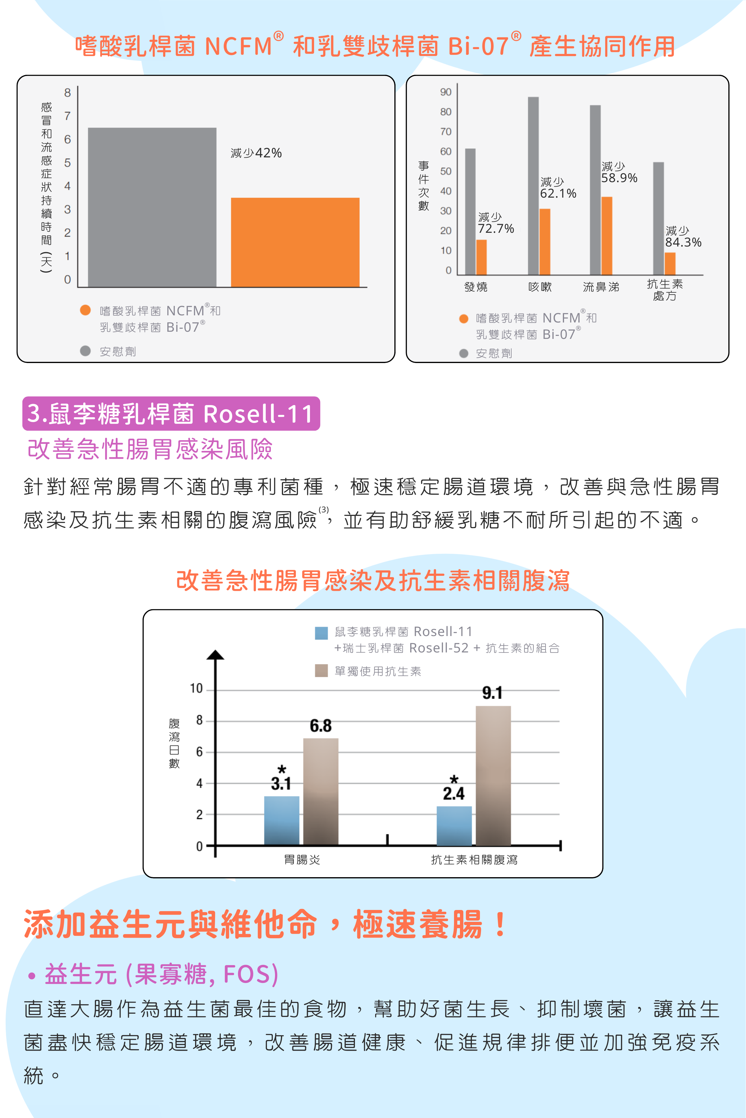 专为儿童设计的益生菌产品,精选三种专利临床验证菌株(NCFM®、Bi-07®、Rosell-11),搭配益生元FOS、维生素C及D3。